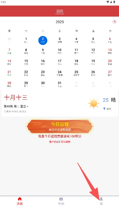 1、具备日历查看与运势查询的功能,用户能够浏览每日的宜忌信息,还可以通过消耗积分来获取详细的运程解读内容。