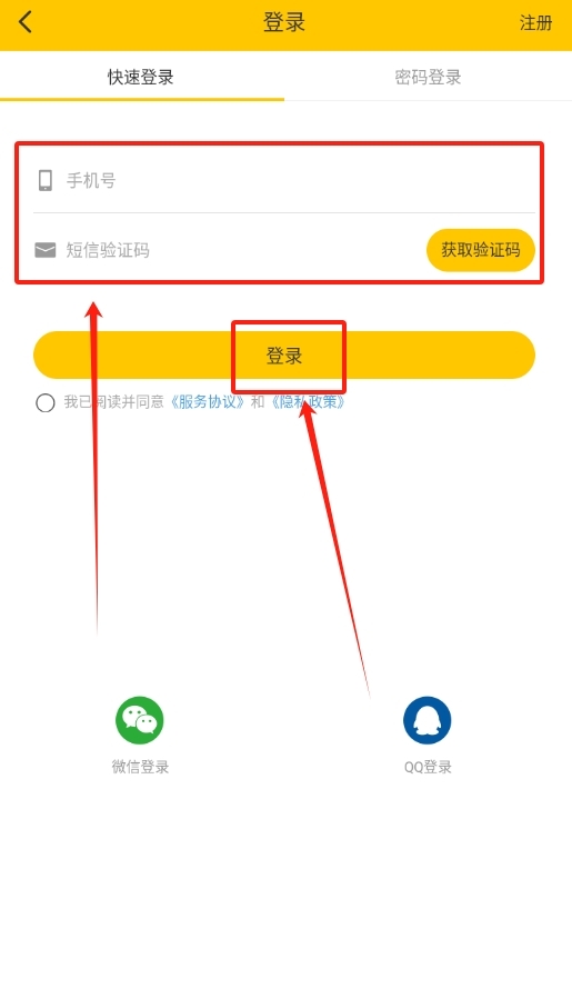 1、启动黄小豹招聘软件,进入登录界面后输入手机号码,再填写收到的验证码即可完成登录操作。