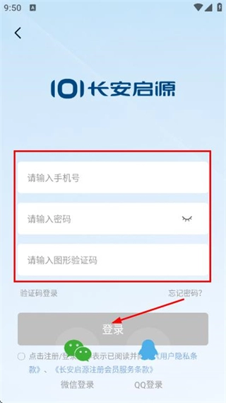 3、在登录页面填写手机号、密码、图形验证码对应的内容,勾选相关协议后点击登录完成账号登录操作。