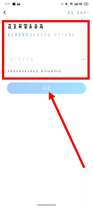 5、在设置密码页面,输入6-16位登录密码,点击确定,完成注册登录。
