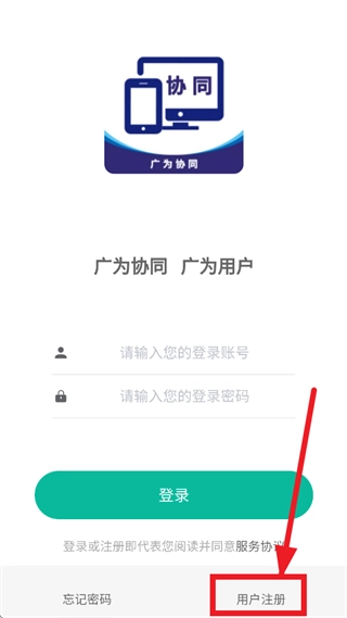 打开广为协同,进入登录界面后下拉界面选择用户注册
