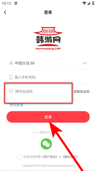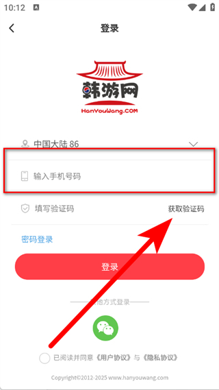 3、在登录页面,输入手机号码后,点击获取验证码。