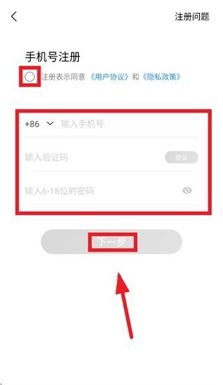 在注册界面,勾选注册表示同意 《用户协议》 和 《隐私政策》,输入手机号,验证码,密码,点击下一步注册即可