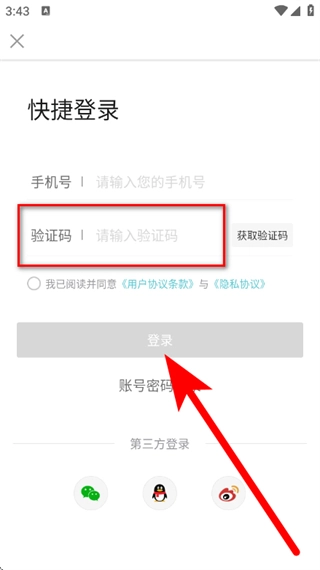 3、在快捷登录页面,输入手机号,点击获取验证码。