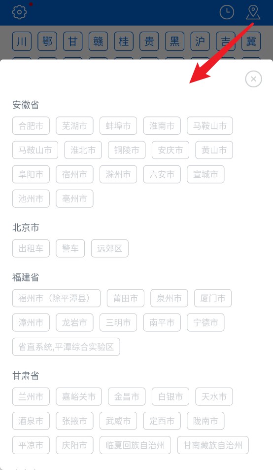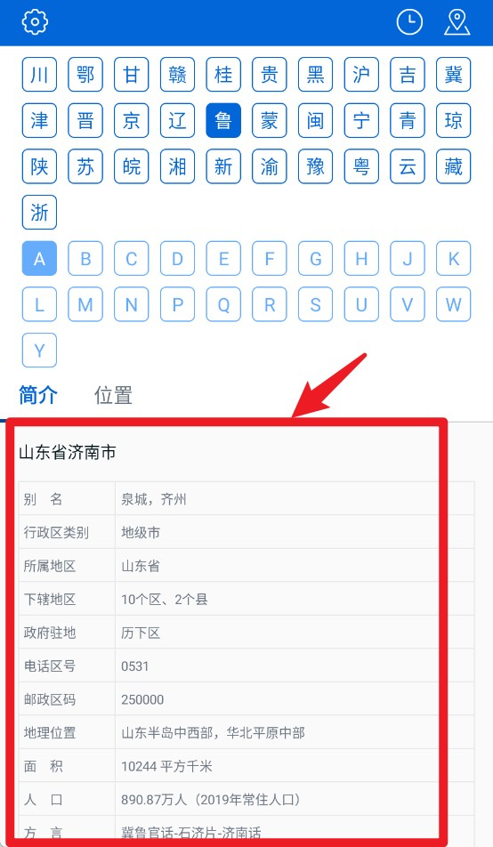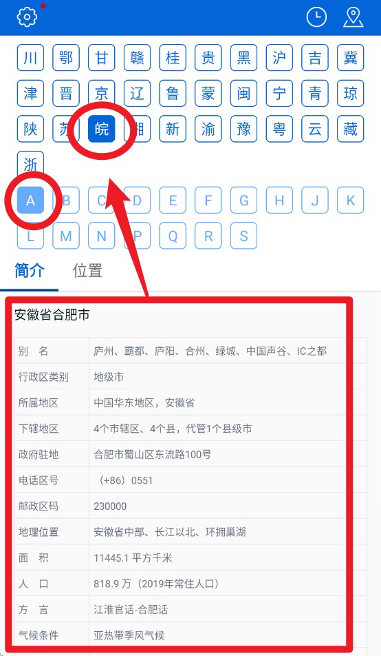1、点击省份简称后,再点选字母查看城市信息内容。