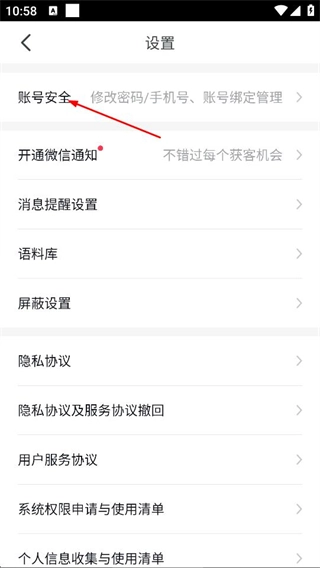 3、进入设置页面后,找到并点击账号安全选项,即可进入账号安全页面。