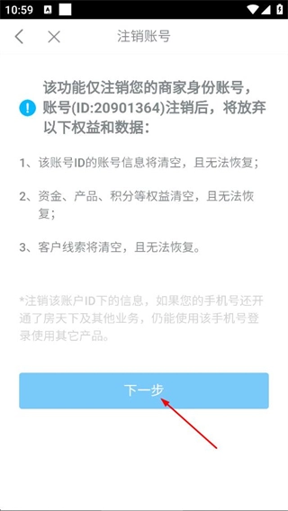 5、进入注销账号页面后,仔细阅读相关提示信息,随后点击“下一步”按钮,即可跳转至安全验证页面。