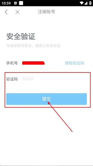 6、进入安全验证页面后,输入收到的验证码,随后点击提交按钮,即可完成账号注销的安全验证步骤。