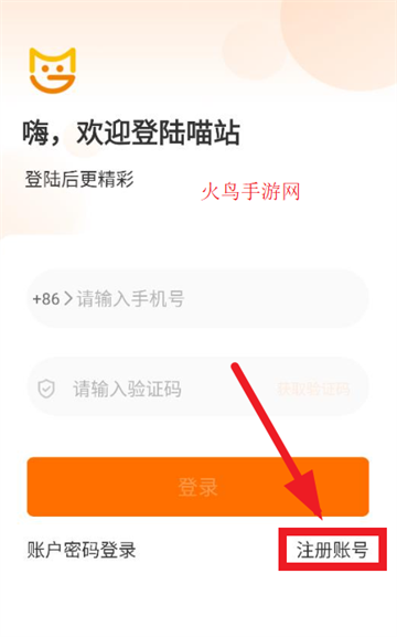 下载安装并打开喵站app,进入登录界面后点击注册账号