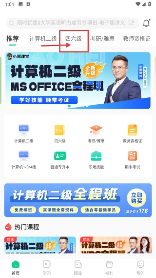1、打开学习类应用,点击顶部的四六级分类标签,即可进入四六级专属页面。