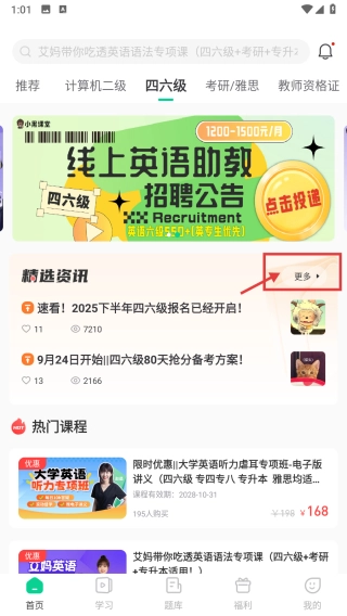 2、进入四六级页面后,找到精选资讯板块并点击其右侧的更多按钮,即可查看并浏览完整的资讯列表。