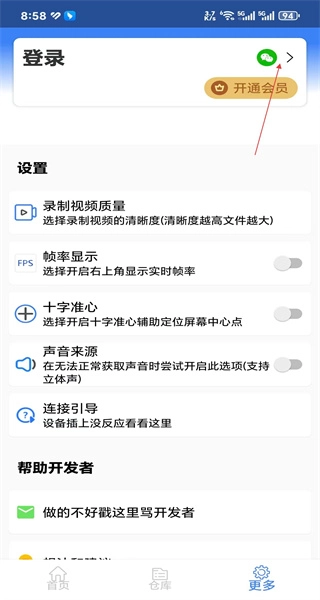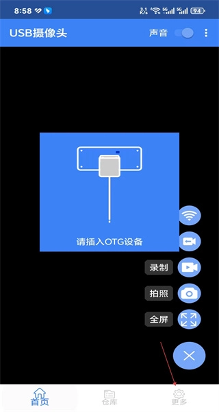 打开软件进入首页后,看到插入OTG设备的提示,点击“更多”选项进入设置页面。