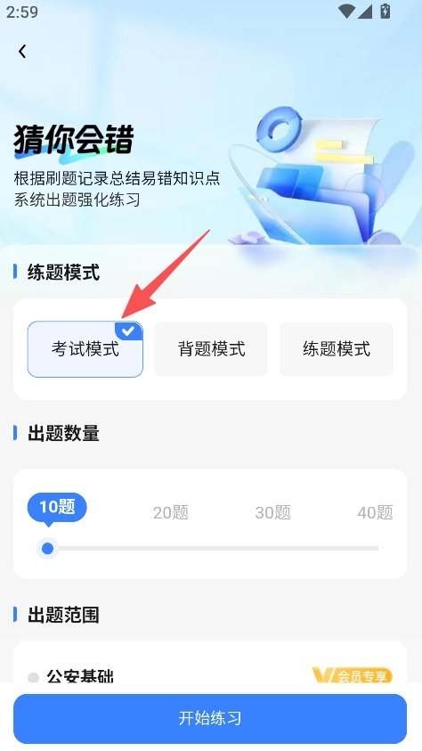 2、点击猜你会错,选择考试模式,开始练习。
