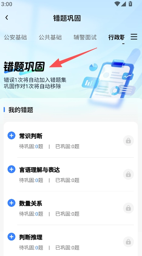 1、启动软件后,找到行政职业能力测验板块并点击,随后进入对应的学习页面。