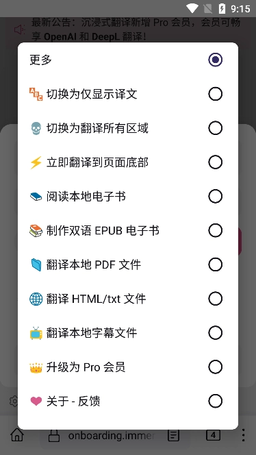 沉浸式翻译是一款非常实用的手机翻译软件,可以帮助我们精准翻译屏幕中出现的外语文本。并且还支持视频字幕的翻译,当我们在看外文视频的时候就会进行双语字幕的显示,这样就能够轻松地了解视频中的内容。沉浸式翻译还支持PDF翻译功能,由于了AI服务,所以能够在保留原文档排版的情况下将PDF文档翻译出来!当然要是我们在浏览外语漫画时,看到有自己不懂的图片,也可以打开沉浸式翻译进行在线翻译,做到边翻译边看漫!