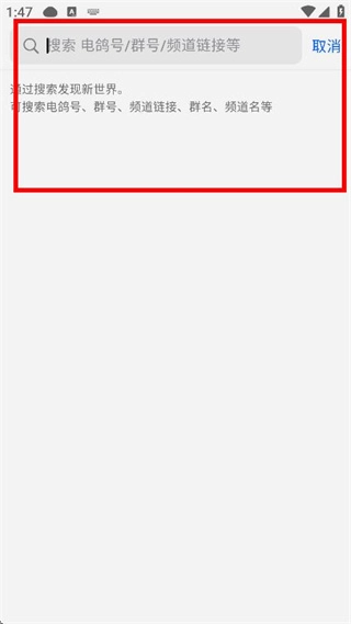 4、在搜索页面,可输入电鸽号、群号、频道链接等信息进行搜索。