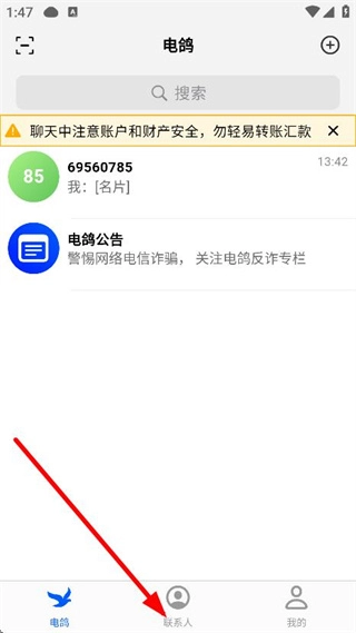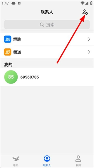 1、打开电鸽主界面后,点击底部的“联系人”选项,即可进入联系人页面。