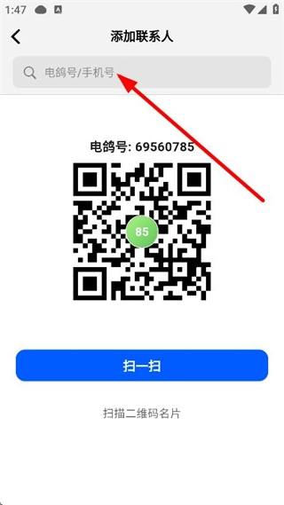 3、进入添加联系人页面后,点击电鸽号手机号对应的搜索框,即可跳转至搜索页面。