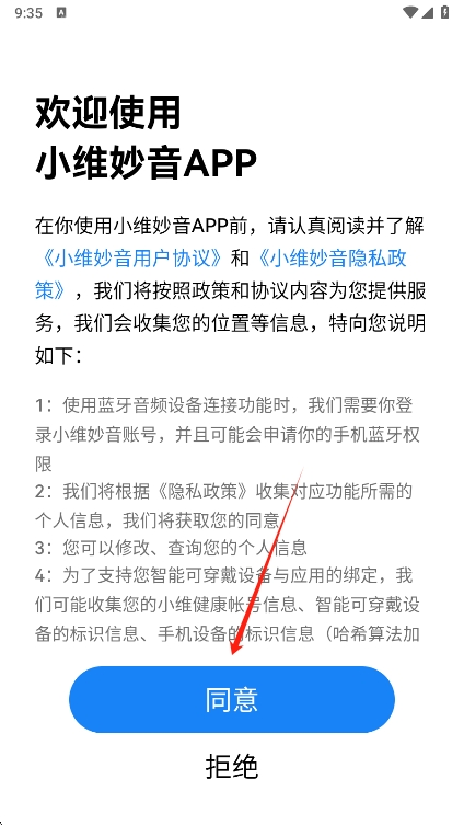 打开小维妙音后,在进入首页之前需要先同意相关的用户协议。