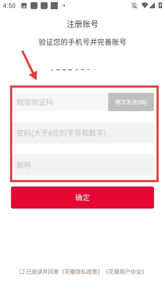 4、填写短信验证码,设置密码(需为6位以上的字母与数字组合)以及昵称,即可完成账号注册流程。