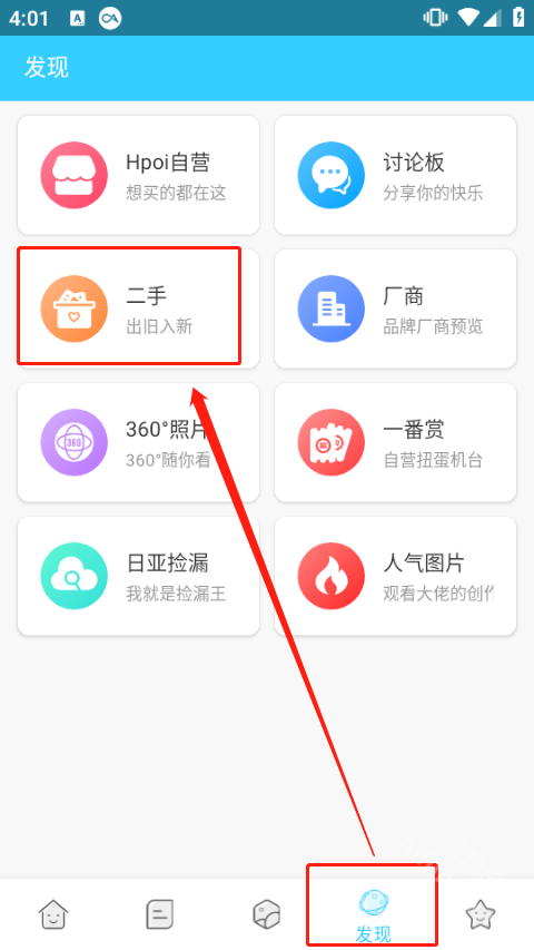 1、第一步是打开hpoi,接着借助底部菜单栏进入发现版块,然后选择二手选项;