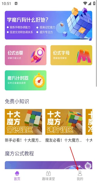 打开软件后进入首页,能看到魔方相关的功能与教程,接着点击“我的”进入个人中心页面。