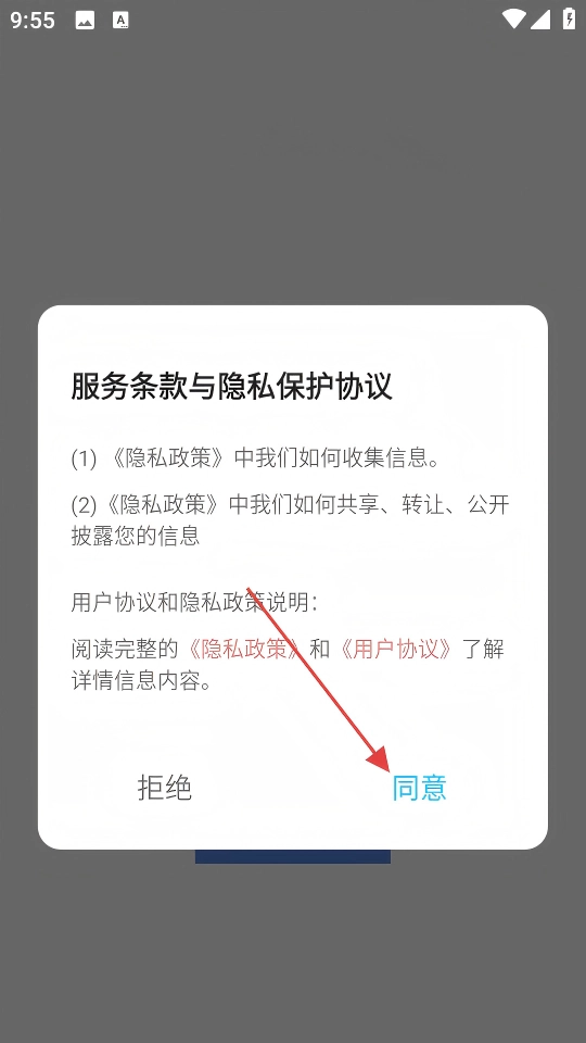 1、软件启动时,出现【服务条款与隐私保护协议】弹窗,点击【同意】。