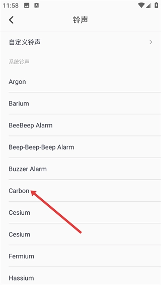 3、进入铃声页面后,选择系统铃声(例如【Carbon】),即可完成闹钟铃声的设置。