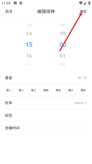 4、在确认好时间、铃声等各项设置后,点击右上角的【确定】按钮,这样就能保存并启用这个闹钟了。