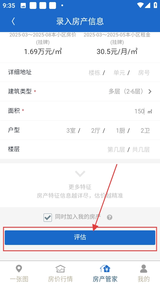 2、在房产信息录入界面填写好详细信息后,点击【评估】按钮,就能得到房产评估结果了。
