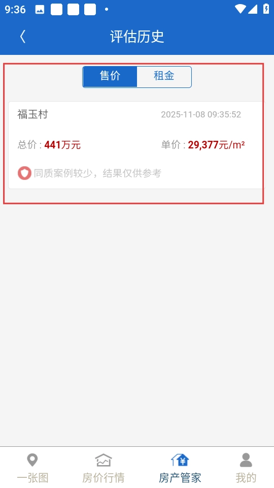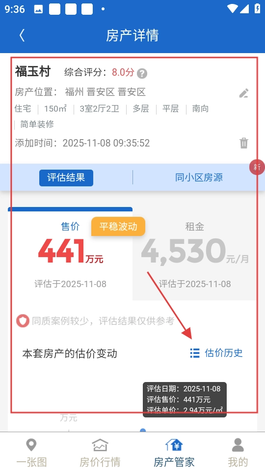 在房产详情页面可以查看评估结果,点击【估价历史】按钮,即可查看过往的评估记录。