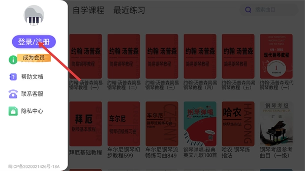 1、点击界面左上角的头像区域,即可展开侧边菜单,该菜单包含登录/注册、会员等功能。