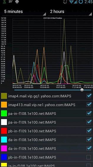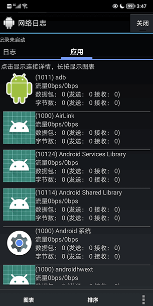 7、在各个标签页内轻点应用,即可查看该应用所连接的时间线,下拉通知栏后会显示出连接的吞吐速率(单位:kbps)