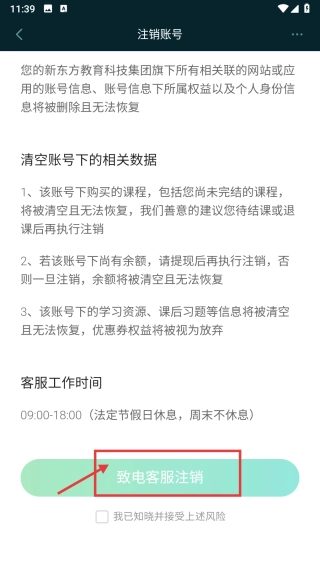 4、进入注销账号说明页面后,勾选“我已知晓并接受上述风险”选项,随后点击“致电客服注销”按钮,即可完成账号注销流程。