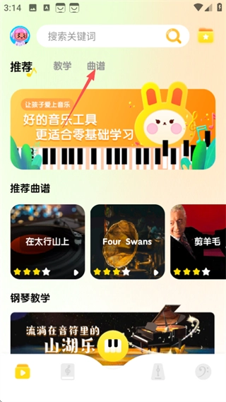 1、在自由钢琴首页,点击曲谱选项,进入曲谱页面。
