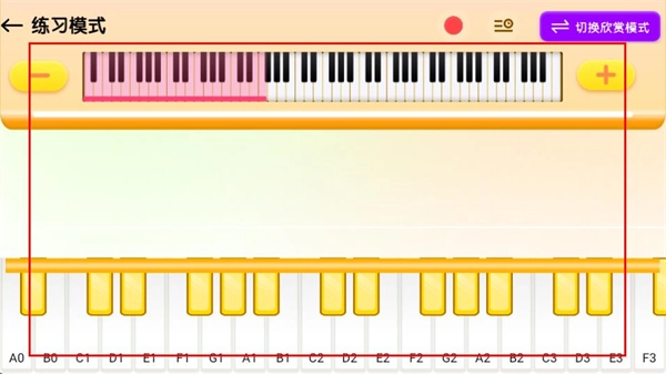 3、进入练习模式页面后,能依照提示在虚拟钢琴上开展弹奏练习。