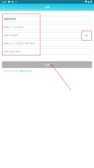 3、进入注册页面后,先选择【学权】选项,接着依次填写【11位手机号码】【验证码】以及【6至14位的密码】,在确认同意相关协议后,点击【注册】按钮即可完成账号的创建。