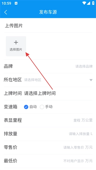 4、进入车源发布页面后,点击【选择图片】按钮上传车辆相关图片,接着填写车辆品牌、所在地等必要信息,即可完成车源的发布操作。