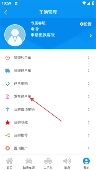3、进入车辆管理页面后,点击【发布过户车】按钮,即可跳转至发布车源页面。