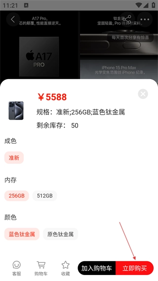 4、进入规格选择页面后,先确认好内存、颜色等具体规格,接着再次点击【立即购买】按钮,就能顺利完成整个购买流程了。