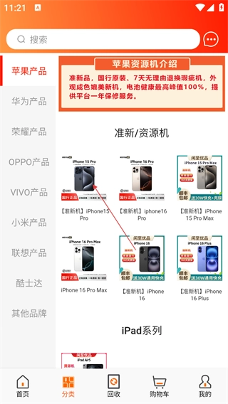2、进入分类页面后,挑选目标品牌的产品,例如在苹果产品里选择【iPhone15Pro】。