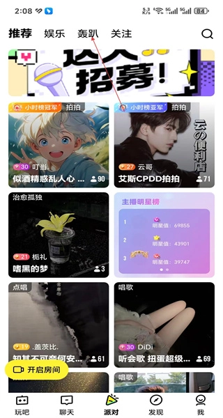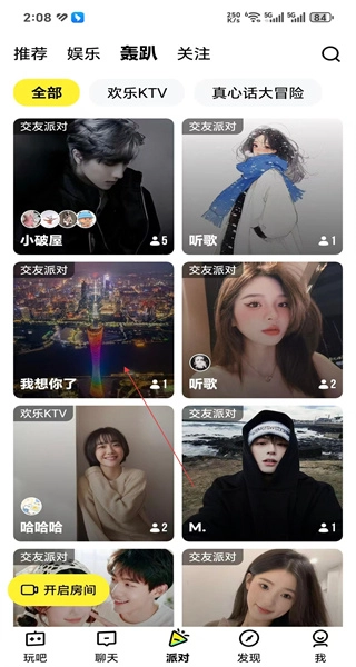 3、在轰趴分类下选择我想你了这个交友派对,点击进入该派对的互动房间。