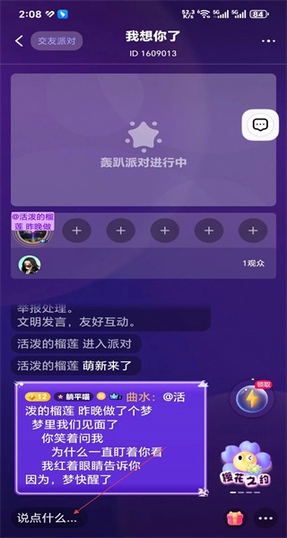 4、进入派对房间后,可查看派对状态,还能在输入框发送内容参与聊天互动。