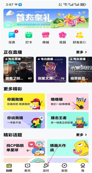 1、打开软件后,进入首页,看到任务、打卡等功能,点击派对进入对应页面。