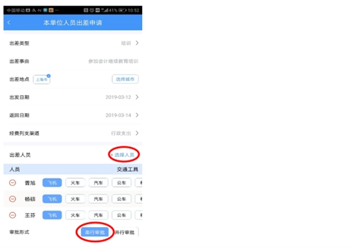 6、出差人员选择:点击“选择人员”按钮,选定所在部门的出差人员,支持添加多位同行人员。