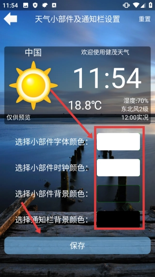 4、在天气小部件及通知栏设置界面,【选择颜色】后点击【保存】,即可完成主题风格设置操作。
