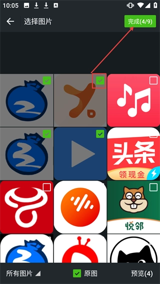 3、在图片选择界面选好需要拼接的图片后,点击右上角【完成(4/9)】按钮,确认选择的图片。