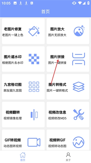 1、在应用首页找到【图片拼接】功能入口,点击进入即可开始图片拼接操作。
