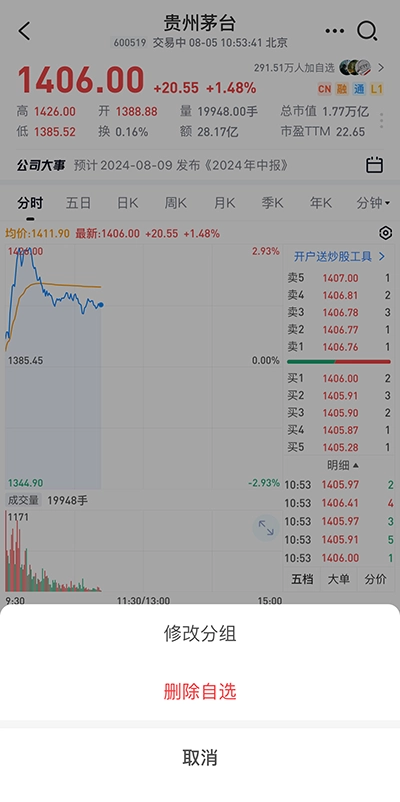 4、关注股票后可进行分组设置:处于关注状态时会显示“设自选”按钮