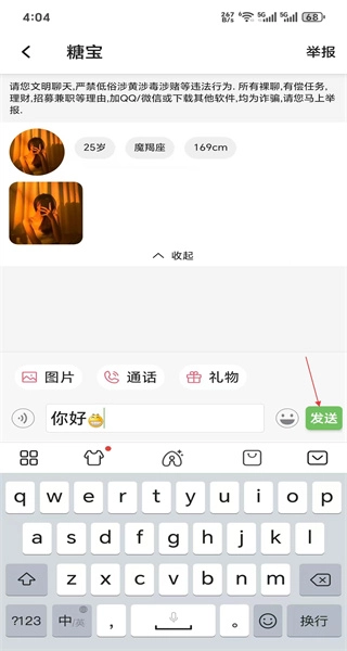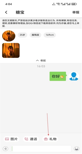 4、完成聊天后,点击页面底部的礼物按钮,即可进入礼物选择界面,向对方赠送礼物。
